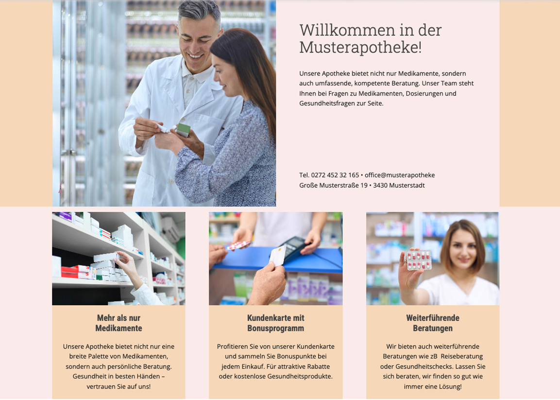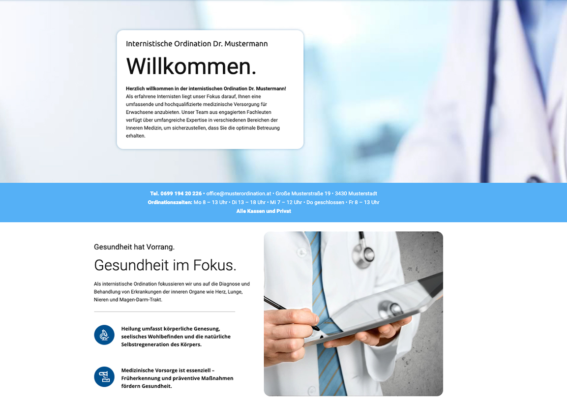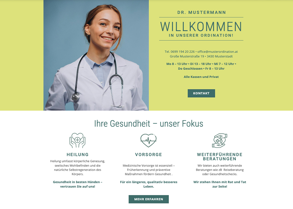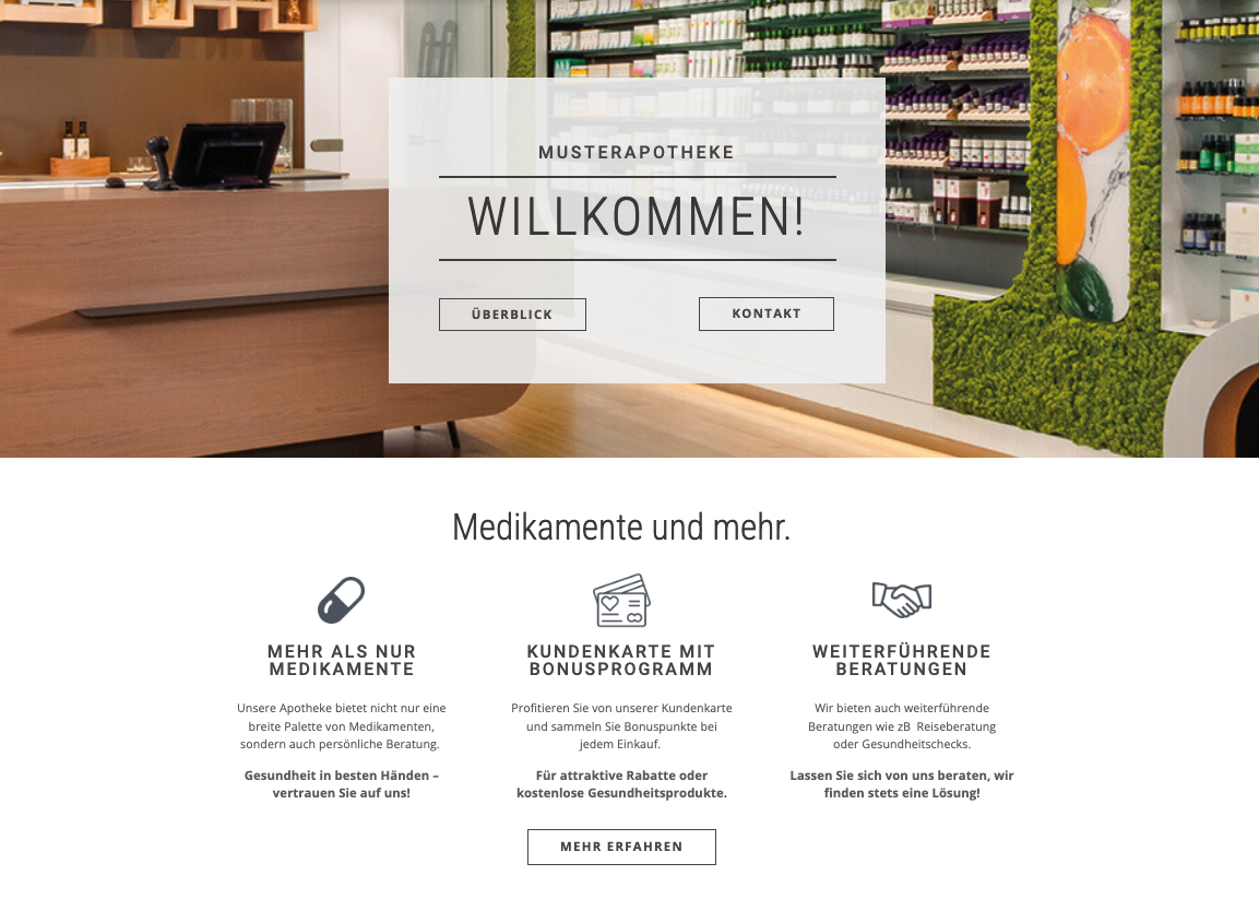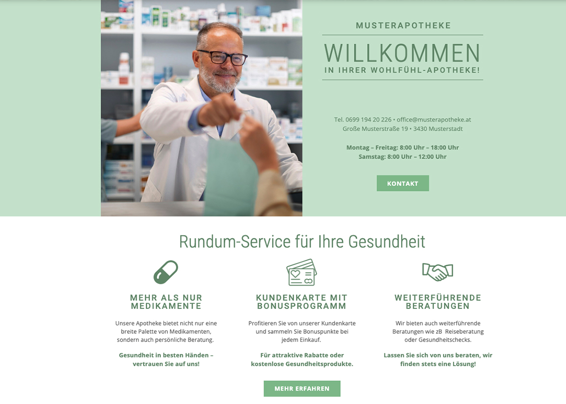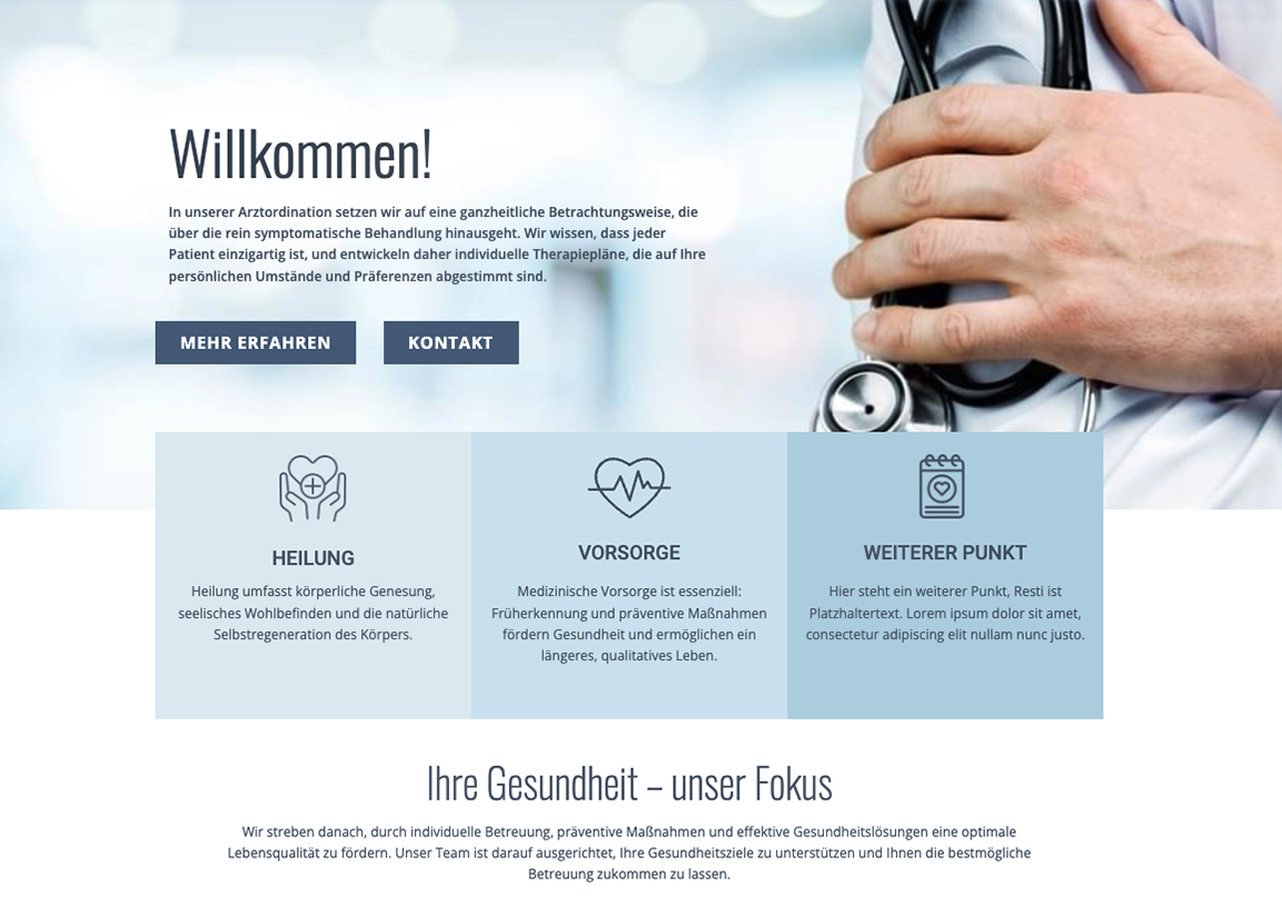 Warum Templates? Unserer Erfahrung nach fehlt es Ärzten und Apothekern oft an Zeit, sich um einen geeigneten Webauftritt zu kümmern. Mit unseren Templates reduziert sich der Aufwand für diese zwei Berufsgruppen hier auf ein Minimum. Wir gehen mit Ihnen das gewünschte Template und die notwendigen Inhalte gezielt und kompakt in nur 2-3 Stunden durch und haben schnelll das Material, um die Webseite zu gestalten. Ihr Aufwand ist somit so minimal wie möglich!